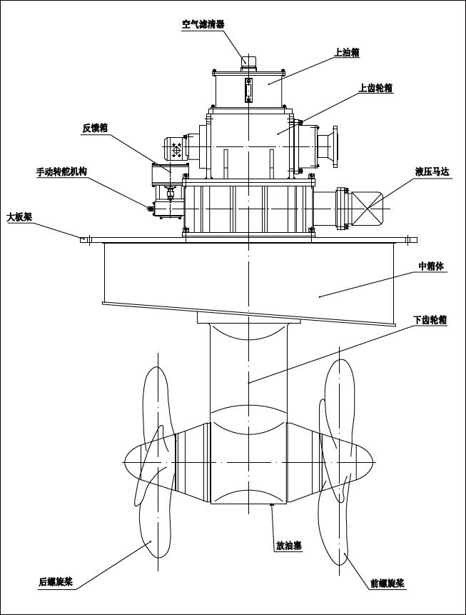 全回转对转桨舵桨外形图 Contra-rotating propeller azimuth thruster outline drawing |