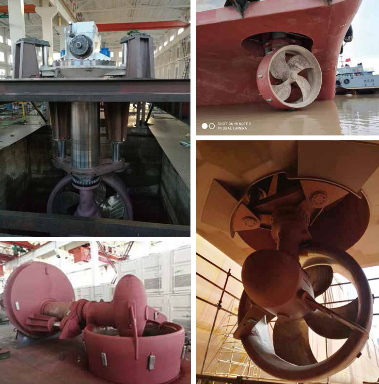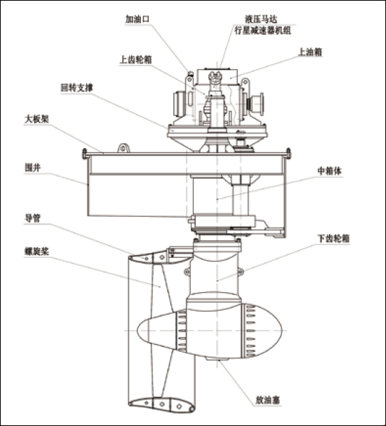 升降式全回转舵浆可以改变桨叶浸深,满足船舶不同吃水的要求。舵桨装置具有升降功能。使用时,在升降机构的作用下,桨叶降低到最低位置。启动动力之后,浆叶旋转,产生推力。不使用时,在升降机构的作用下,桨叶上升到船体基线以上的一定高度,在船舶搁浅时,保护舵桨装置。升降机构由液压油缸伸缩,带动舵浆升降,并采用导轨增加升降过程中舵桨的稳定性。在浆叶产生推力时,导轨还可以增加舵浆下部的刚性,有利于浆叶推力传递到船体上。